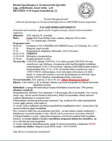 Nevezési határidő: 2026. március 27-én 11.00. óra. (Állami Horgászjegy kötelező)